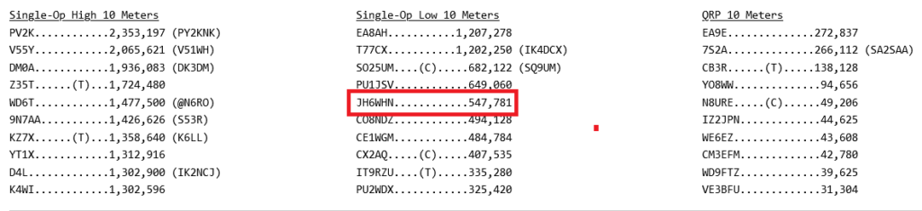 2023 CQ WPX RTTY Raw Scores 投稿者:jh6whn 投稿公開日:2023年2月25日 投稿カテゴリー:10m / CONTEST 投稿コメント:1件のコメント 10m LOW PWR部門でWorld 5位 AS 1位となりました1割以上の大幅減点がない限り順位は変わりそうにありません。大幅減点が無ければ2014年のレコード更新も更新できそうです。 おすすめ 2024 ARRL10m 2024年12月19日 SSN 100以上が続いていますが 2022年5月22日 QSLカード 2024年9月24日 1件のコメントがあります ピンバック: 2023 WPX RTTY結果 – サイクル25のメモ帳 コメントを残す コメントをキャンセルコメントEnter your name or username to comment Enter your email address to comment Enter your website URL (optional) 次回のコメントで使用するためブラウザーに自分の名前、メールアドレス、サイトを保存する。