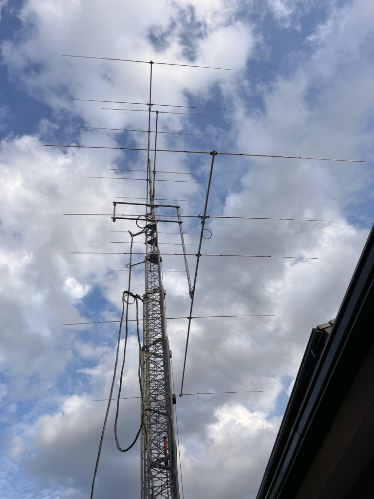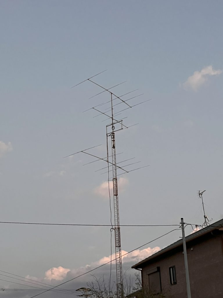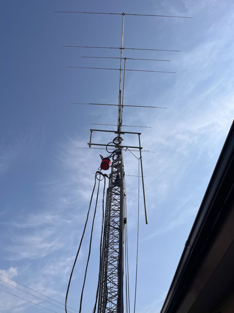 アンテナを、2階より高い位置になる様に、タワーを上げます。しばらくするとカーンと金属音がしました。見上げてよく見ると吊り下げマストがしなっています。引き上げに使ってたロープはつけたままでしたが、問題ないはずと思ってたのですが、2箇所で引っ掛けてたのを忘れていたためロープがアンテナを引っ張って吊り下げマストはしなってました。タワーをある程度下ろしてロープを外しました。③