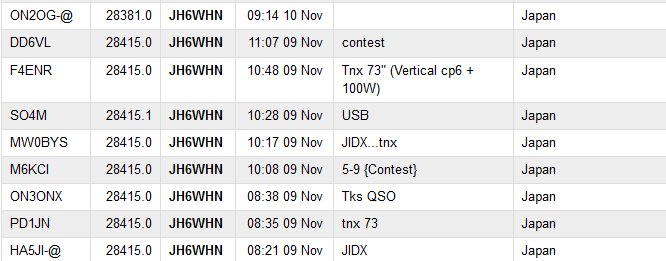 11月9日16時(JST)のスタート直後のCONDXは悪くない感じですがあまり呼ばれず、やっぱり参加局が少ないと思いながらRUNとS&Pの繰り返していました。17時21分にCLUSTERにSPOTされてからは呼ばれ始めました。まもなくS0Sから呼ばれてびっくり。存在を知りませんでしたので??でしたが、後から他の参加局も呼ばれて、コンテスト用コールのようでした。