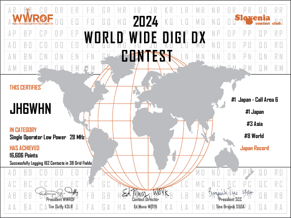 2024 WW DIGI結果 投稿者:jh6whn 投稿公開日:2024年11月19日 投稿カテゴリー:10m / CONTEST 投稿コメント:1件のコメント 2024 WW DIGI結果が発表されていました。 Raw Scores から約2000点減点で16606点でした。JAレコードは更新できました。IN3FSRが約5000点減点で、World 8位になりました。 おすすめ 2024 ARRL10m 2024年12月19日 2023 IARU 2023年8月3日 2023CQ WPX RTTY 2023年2月13日 1件のコメントがあります ピンバック: 2024年まとめ – サイクル25のメモ帳 コメントを残す コメントをキャンセルコメントEnter your name or username to comment Enter your email address to comment Enter your website URL (optional) 次回のコメントで使用するためブラウザーに自分の名前、メールアドレス、サイトを保存する。