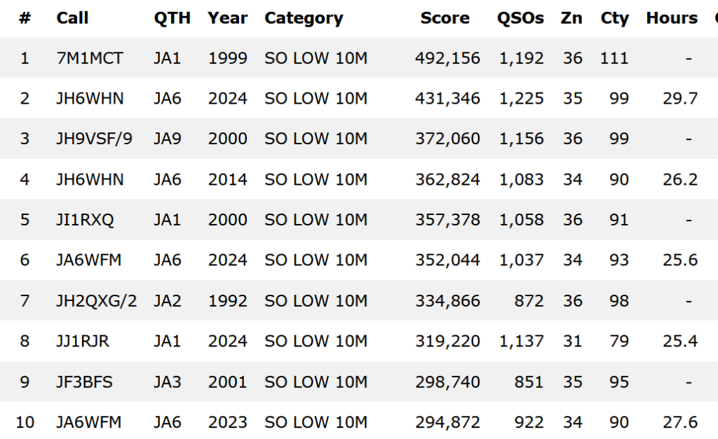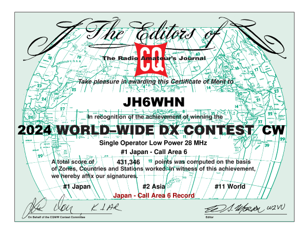 2024 WW CW 結果 投稿者:jh6whn 投稿公開日:2025年3月11日 投稿カテゴリー:10m / CONTEST 投稿コメント:0件のコメント RTTYが発表されたら続いてCWも結果が発表されました。Rawから順位は変わらずでした。2014年の自己最高得点を7万点弱上回り10m LOW部門での歴代2位となりました。しかし、Worldベスト10にはなかなか入れず今回も11位でした。RAW467775 →431346で3万点以上の減点。LCRを見て反省が必要の様です。 おすすめ 2025 RDXC 2025年7月26日 2022 IOTA TEST 2022年7月31日 2024 WPX RTTY結果 2024年3月31日 コメントを残す コメントをキャンセルコメントEnter your name or username to comment Enter your email address to comment Enter your website URL (optional) 次回のコメントで使用するためブラウザーに自分の名前、メールアドレス、サイトを保存する。