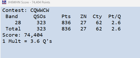 CONDXとしては1日目よりも2日目の方が良い感じでしたので、今日こそはちょびっとオープンを期待していましたが、昨日と違って日の出前はSAは聞こえるものの、日の出直前でもN6ROとかカスカスで聞こえる程度でこりゃダメだとあきらめかけていたところ、07時30分頃からにぎやかになってきました。08時過ぎにZF5TともQSOできました。CQを出すとZONE5からも呼ばれました。途中KL7とやってない事の気づき探して01を送ってる局を見つけましたがいなくなり結局できませんでした。ラスト30分はCQ出しても呼ばれない、S&PでもQSO済みの局ばかりで4局しか増やせず終了しました。